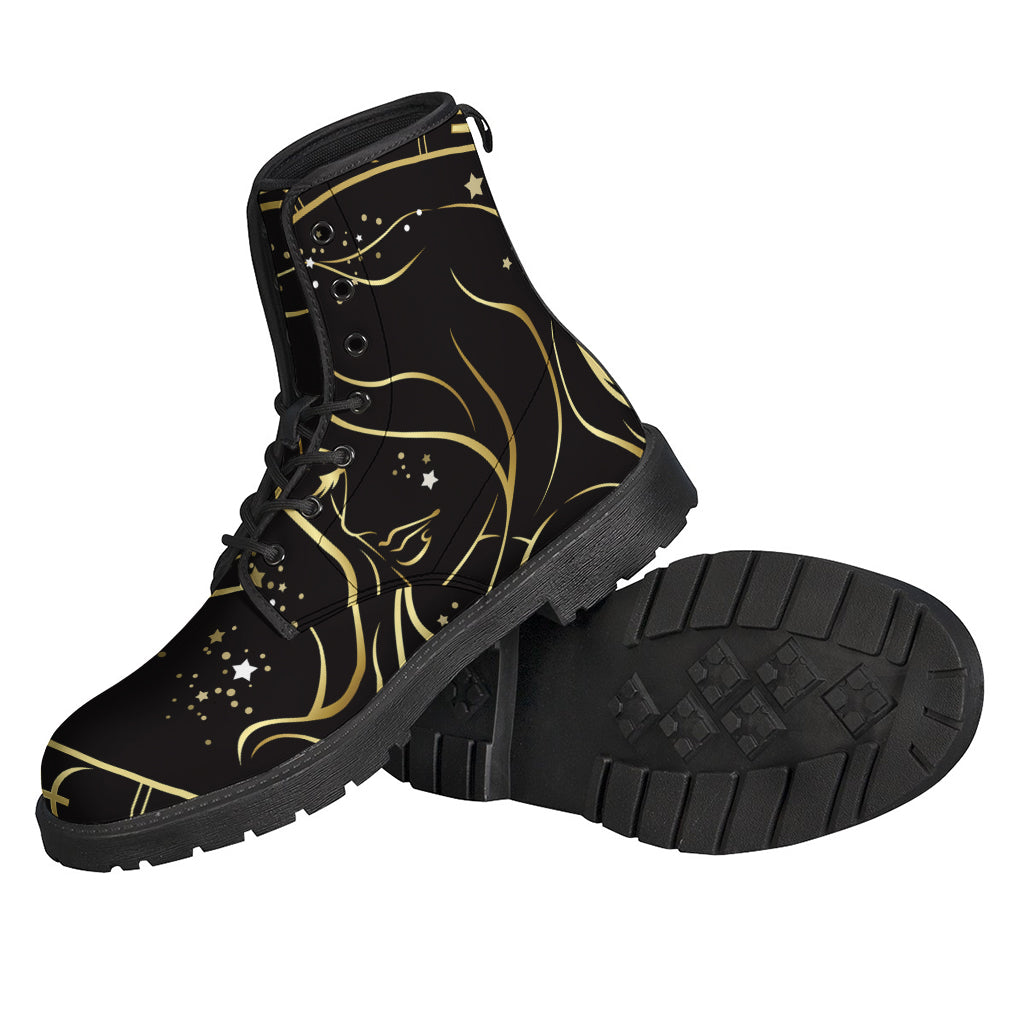 Get in touch with your inner hippie with these Gold and Black Virgo Sign Print Leather Boots from Gear Frost. These lightweight boots feature a unique Virgo sign print on the upper, adding a touch of bohemian flair to any outfit. Made from high-quality leather, these boots are durable and comfortable, perfect for everyday wear. Whether you're headed to a music festival or just want to channel some retro vibes, these hippie-inspired boots are sure to make a statement.