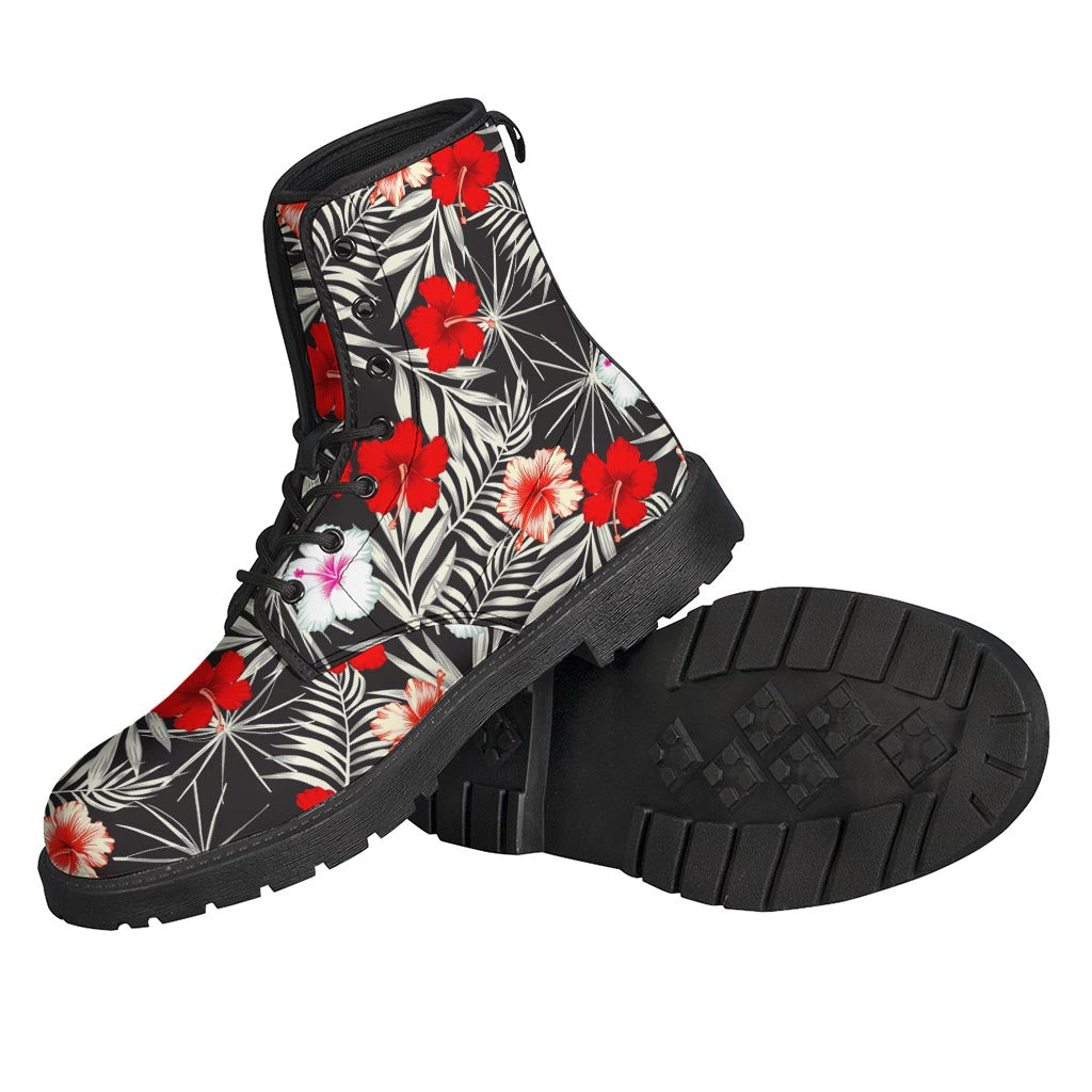 These Hippies Leather Lightweight Boots are a perfect blend of style and comfort for any free spirit. Made from high-quality leather, these boots feature a unique white tropical hibiscus pattern print that will make you stand out from the crowd. The lightweight design ensures all-day comfort, while the durable construction ensures these boots will last through all your adventures. Whether you're heading to a music festival or just out for a casual day, these boots are sure to complement your hippie style and add a touch of bohemian flair to any outfit. Whether you pair them with a flowy dress or your favorite jeans, these boots are the perfect statement piece for any hippie fashionista.