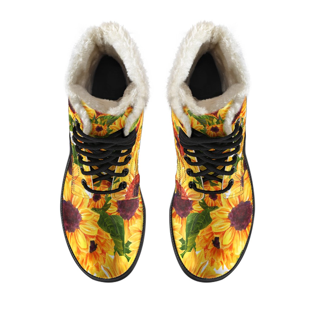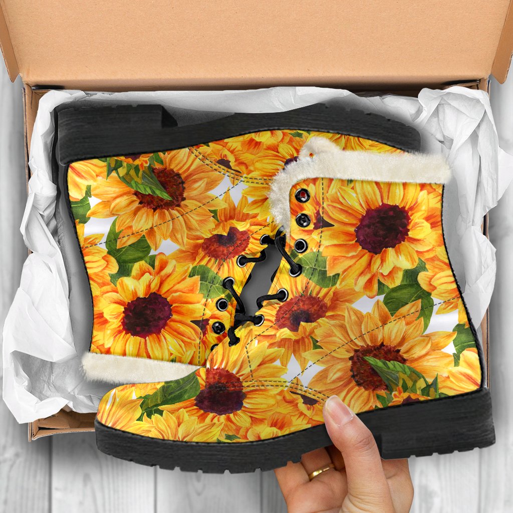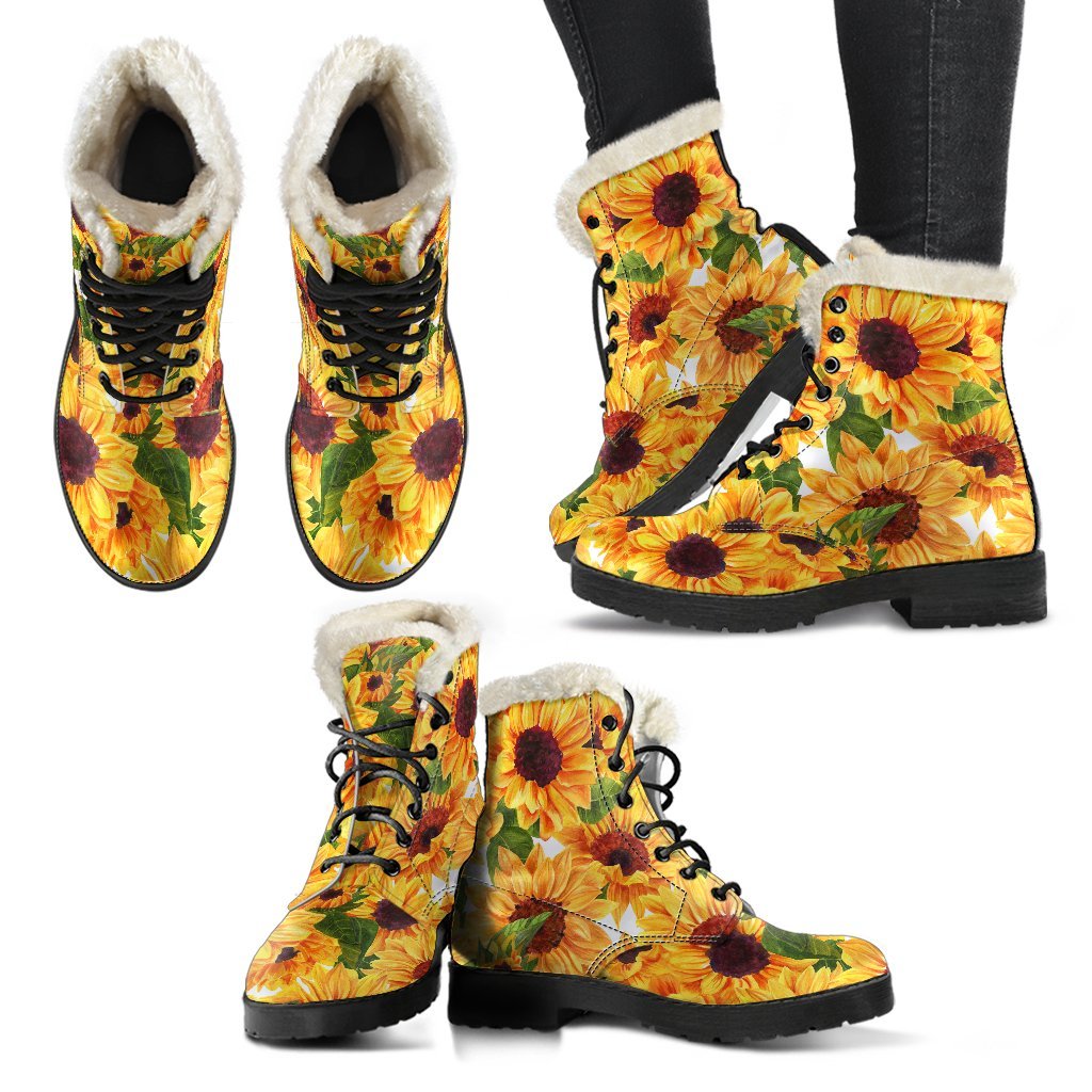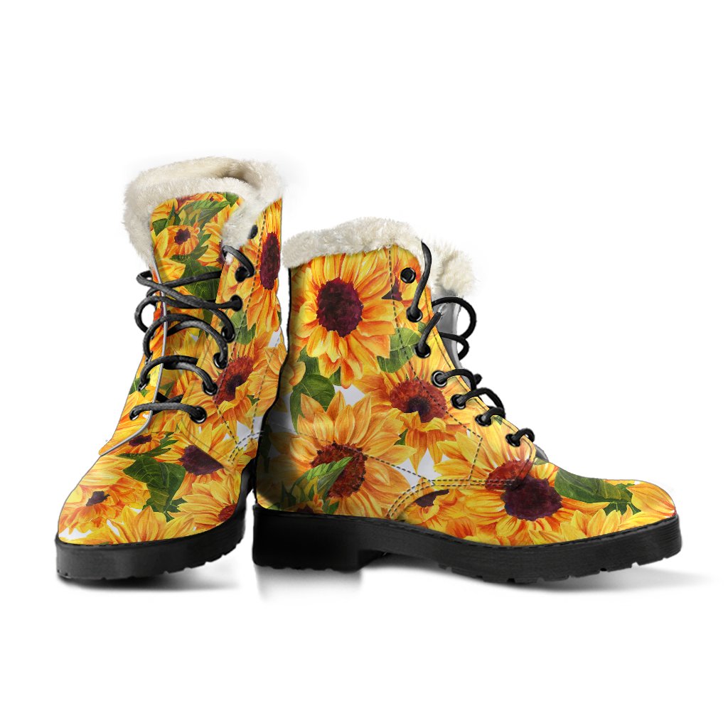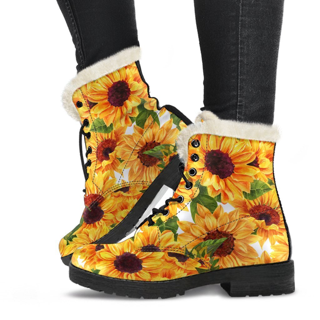 These hippie style boots are a perfect addition to any free-spirited wardrobe. The Watercolor Sunflower Pattern Print adds a whimsical and artistic touch to the overall design. The faux fur lining provides both style and warmth, making these boots perfect for the cooler months. The leather exterior adds durability and a touch of edginess to the look. These boots are perfect for bohemian babes who want to add a touch of retro flair to their ensemble. Walk in comfort and style with these hippie faux fur leather boots.