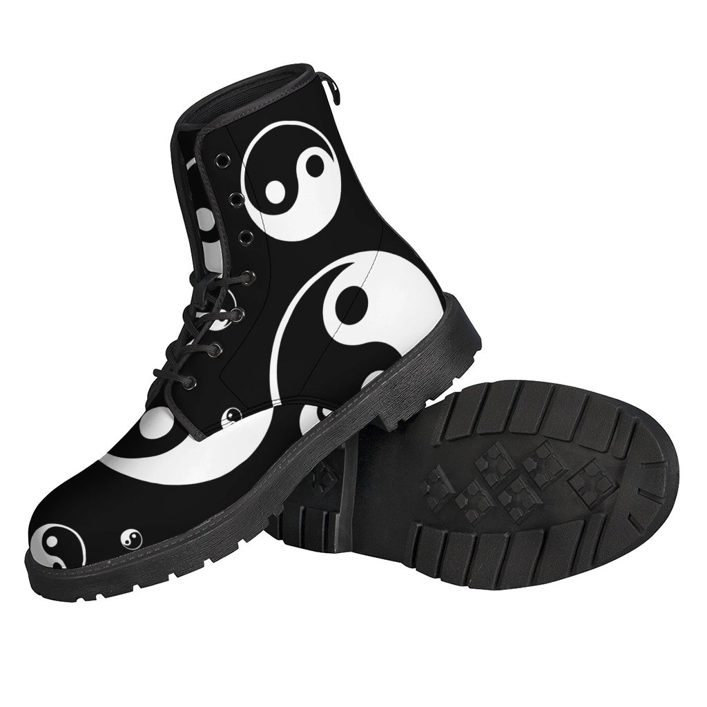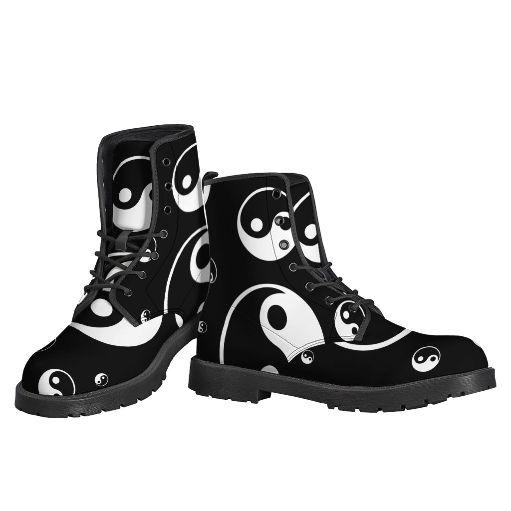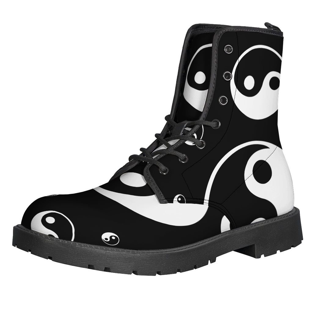 These black and white Yin Yang pattern print leather boots are the perfect addition to any hippie's wardrobe. Made with lightweight leather, these boots are comfortable and easy to wear all day long. The Yin Yang pattern adds a unique and spiritual touch to the boots, perfect for those who embrace peace, love, and harmony. These boots are the perfect mix of style and comfort, making them a must-have for any hippie looking to add a touch of bohemian flair to their outfit.